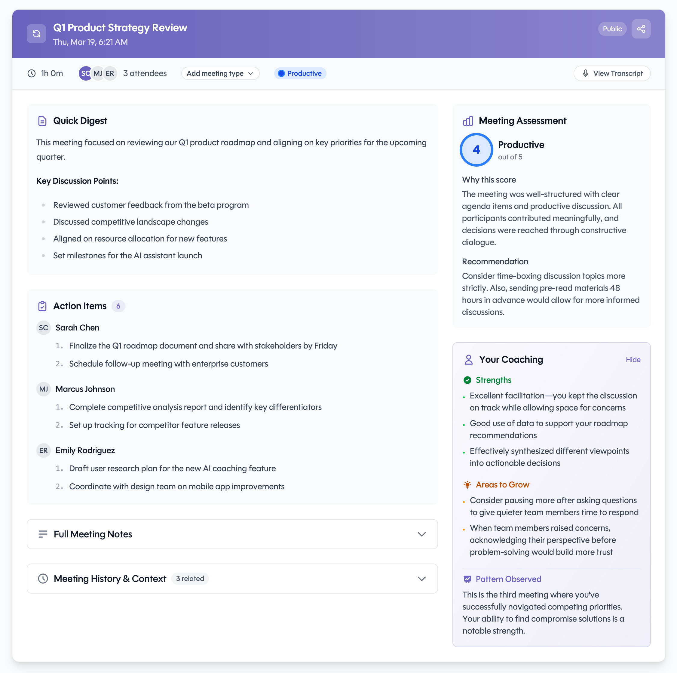 Structured, searchable notes — not a wall of text. Key points, decisions, and context captured automatically.